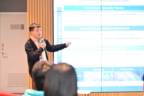本次活动由陶氏公司亚太区校园招聘负责人陆振辉担任主持人。他全面系统地介绍了陶氏公司的发展历程、业务布局以及人才战略。陶氏公司源于美国,拥有120年的悠久历史,在全球30多个国家和地区设有生产基地,并于2009年在上海设立大中华区总部。公司专注于材料科学领域,业务覆盖包装、消费产品、汽车和基础设施等核心领域,同时持续加大在研发与科研人才方面的投入,充分彰显了陶氏这一全球领先企业源源不断的发展创新活力。