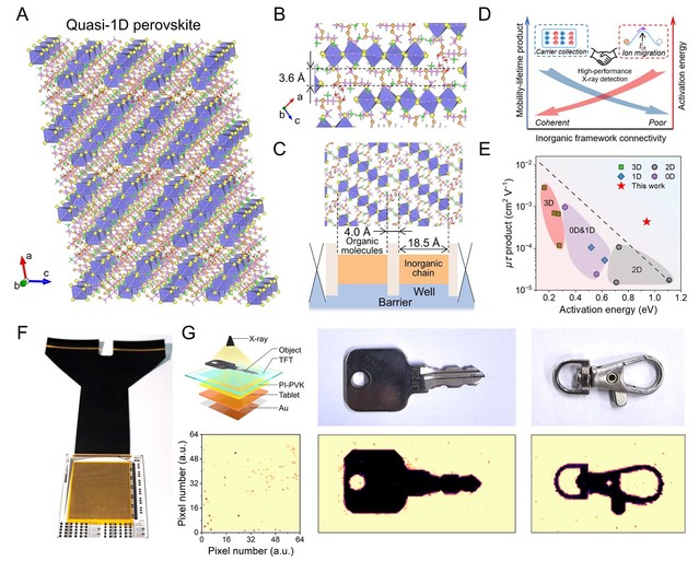 针对上述问题,研究团队开发了新型准一维钙钛矿单晶材料—胱胺铅碘,该结构由角共享的五重八面体(18.5 Å)一维链组成,且沿晶体取向具有较小链间距(4.0 Å),有效解耦了离子与电子的传输路径。准一维钙钛矿材料能同时实现高效的载流子收集和离子迁移的抑制,获得了1.49×1010 cm–4的低陷阱密度、4.35×10–4 cm2 V–1的大迁移率-寿命乘积以及0.94 eV的离子迁移活化能。组装的X射线探测器展现出高达1.42×105µC Gy−1 cm−2的灵敏度(平均X射线能量为42.7 keV),以及优异的环境/工作/电场/热稳定性,电流漂移低至2.91×10−7 nA cm−1 s−1 V−1。作为概念验证,研究团队成功地将准一维钙钛矿材料与薄膜晶体管背板可靠集成,用于高分辨的X射线成像。这项工作强调了通过调控结构尺寸和框架连接性来实现灵敏稳定的X射线探测的重要性,为其实际应用铺平了道路。